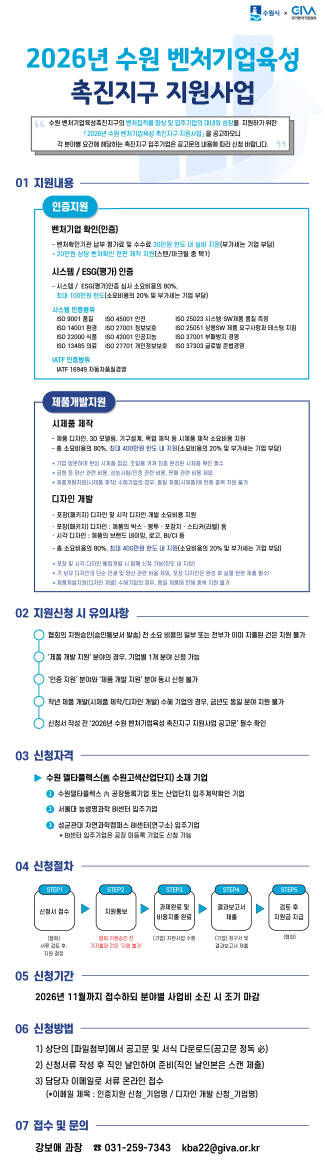 모집 공고일(2월 25일) 기준 수원 벤처기업육성촉진지구 내 입주기업이 신청할 수 있다. ▲수원델타플렉스 1~3단지 공장등록기업 또는 사업 단지 입주계약확인 기업 ▲서울대학교 농생명과학 창업지원센터 입주기업 ▲성균관대학교 자연과학캠퍼스 창업보육센터·연구소 입주기업 등이 대상이다.