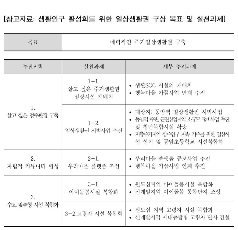 이를 위해 주거일상생활권내 일상시설의 기능전환 등을 통하여 거주하고 있는 계층에 부합하도록 재배치하고, 우리마을 플랫폼을 조성하여 자립적 생활권 구축을 위한 동네거점 형성, 지역별 거주 계층에 부합한 아이돌봄시설 및 고령자시설 복합화 등이 요구된다.