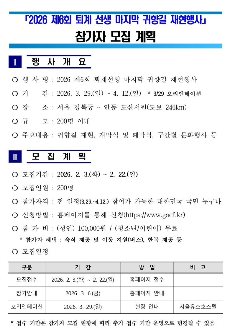 [경북 세계타임즈=한윤석 기자] 경상북도와 경북문화재단은 문화체육관광부 지원을 받아, 3월 29일부터 4월 12일까지 진행되는‘제6회 퇴계 선생 마지막 귀향길 재현행사’를 앞두고, 대장정 참가자를 2월 22일(일)까지 모집한다.