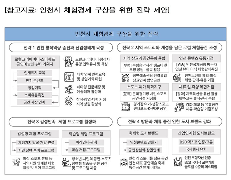연구책임자인 최태림 연구위원은 “산업구조가 고도화된 도시는 첨단산업뿐만 아니라, 그 도시에서만 경험할 수 있는 체험의 질이 도시 경쟁력에 중요한 요인이 될 것이다”라며, “인천은 항만・공항・도시・문화 자산을 결합한 체험기반 산업육성을 통해 글로벌 미래도시로 도약할 수 있는 충분한 잠재력을 보유하고 있다”라고 밝혔다.