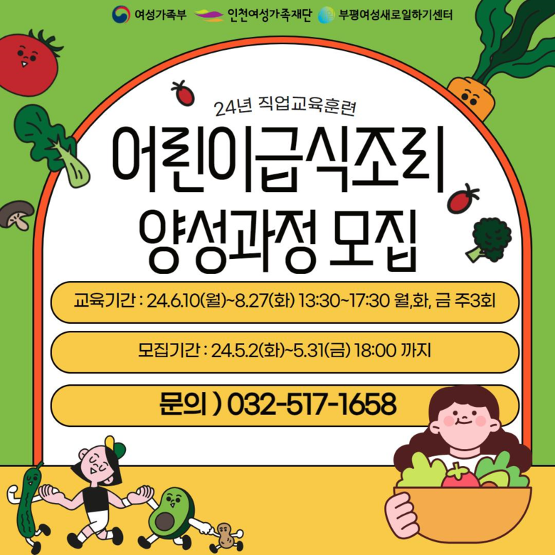 취업을 희망하는 경력단절 여성 중 한식조리사 자격증을 소지하고 어린이급식조리사로 취업을 희망하는 분이라면 누구나 신청이 가능하며 5월 2일부터 5월 31일 까지 이메일(saeil2011@hanmail.net)이나, 부평새일센터로 방문 신청이 가능하다.