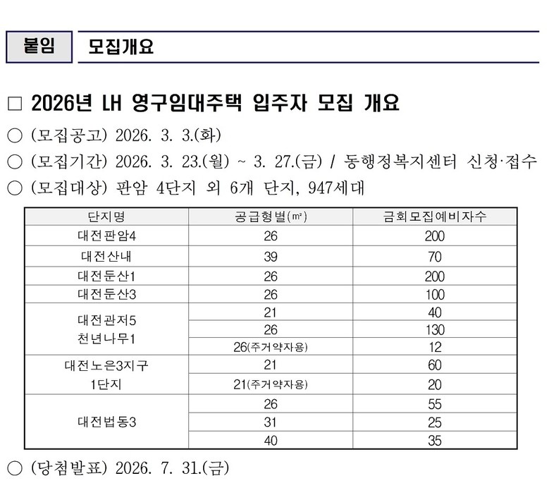 [대전 세계타임즈=이채봉 기자] 대전시는 저소득 취약계층의 주거안정을 위해 3월 23일부터 5일간 ‘2026년 LH 영구임대주택 예비 입주자’를 모집한다.