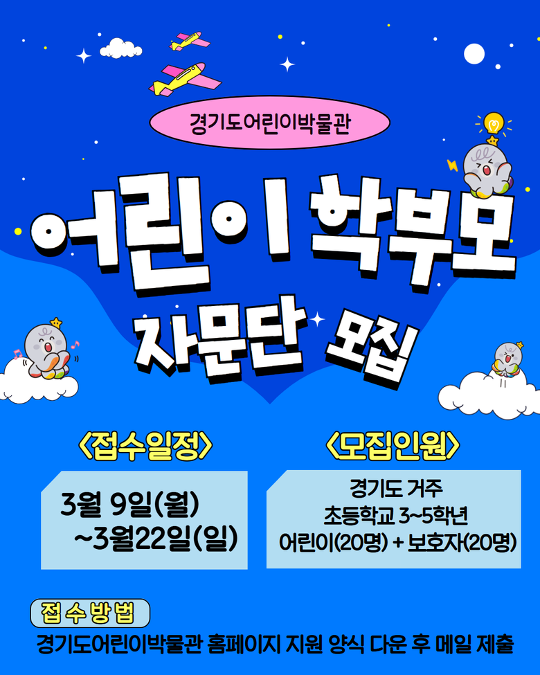 이번 자문단 모집은 2026년 3월 9일(월)부터 3월 22일(일)까지 진행된다. 신청 대상은 경기도에 거주하는 초등학교 3~5학년 어린이와 보호자이며, 선발된 자문단은 2026년 한 해 동안 박물관의 전시·교육·행사 등 주요 사업의 기획 단계에서 사전 체험과 의견 제시를 통해 실제 운영에 참여하게 된다. 참여를 희망하는 어린이와 학부모는 경기도어린이박물관 홈페이지를 통해 신청할 수 있다.