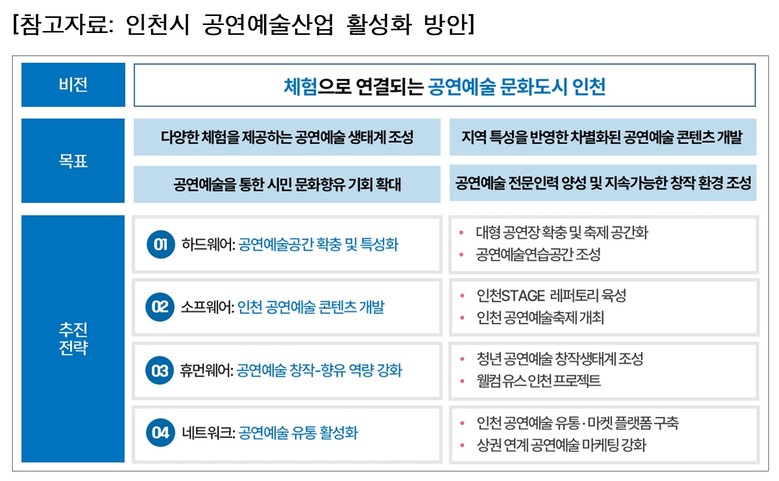 ▲하드웨어 부문에서는 공연예술공간 확충 및 특성화를 통해 활동 기반을 다지고, ▲소프트웨어 부문에서는 인천 공연예술 콘텐츠 개발을 통해 도시의 문화적 정체성을 강화하고자 했다. ▲휴먼웨어 부문에서는 청년 공연예술인을 통합 지원하고, 아동·청소년 대상 체험형 프로그램을 강화하여 미래 관객 및 예술인재를 육성하고자 했다. ▲네트워크 부문에서는 공연예술 통합 정보 플랫폼을 활성화하고, 공연예술 유통 활성화를 위한 공연예술마켓 및 상권 연계 마케팅 강화 방안을 제안했다.