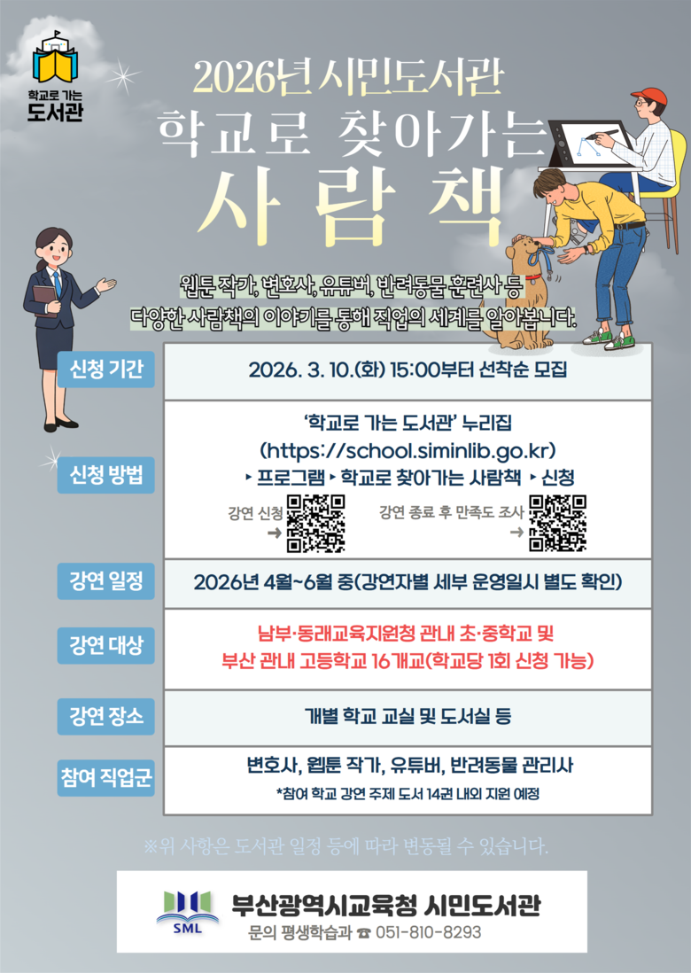 참가를 희망하는 학교는 오는 10일 오후 3시부터 ‘학교로 가는 도서관’ 누리집(https://school.siminlib.go.kr)을 통해 선착순으로 신청하면 된다. 자세한 내용은 도서관 평생학습과(☎051-810-8293)로 문의하면 된다.