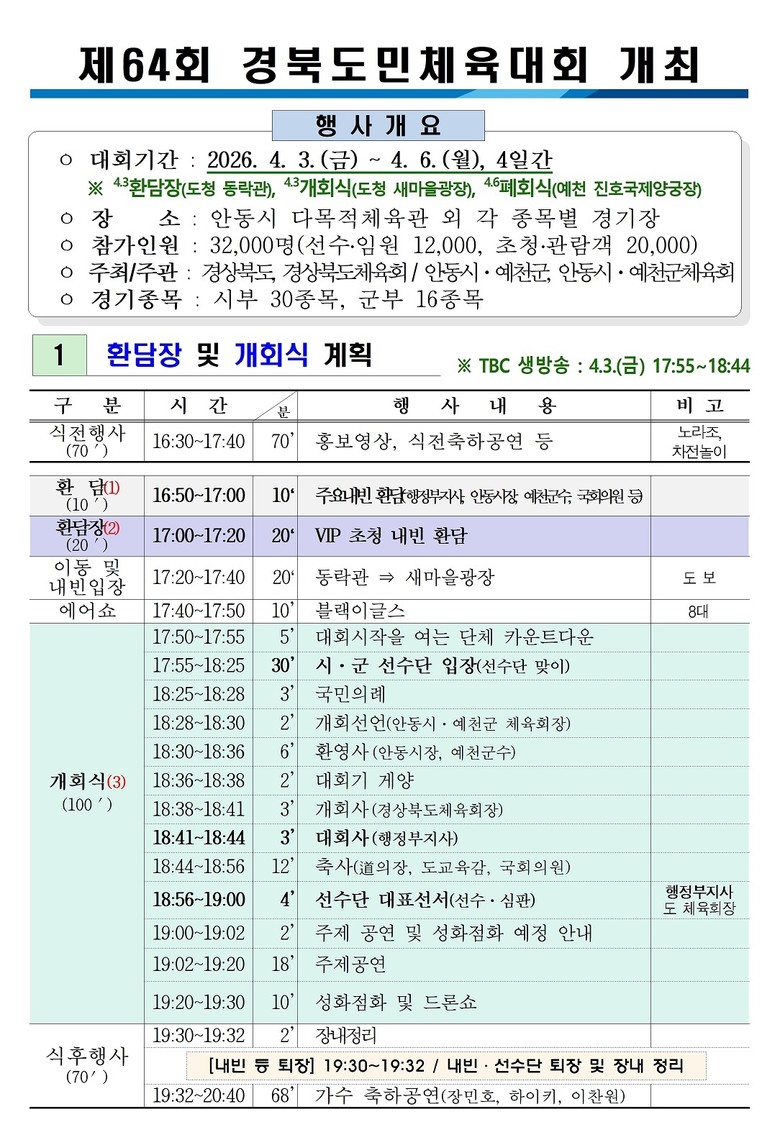 경상북도는 오는 4월 3일부터 6일까지 4일간 안동시와 예천군 일원에서 ‘제64회 경북도민체육대회’를 개최한다. 이번 대회는 도청 이전 10주년을 기념해 안동과 예천이 처음으로 공동 주관하며, ‘함께여는 화합체전, 미래여는 경북도민’을 구호로 내걸었다. 총 30개 종목에 22개 시·군 선수단 12,000여 명이 참가해 열띤 경쟁을 펼칠 예정이다.