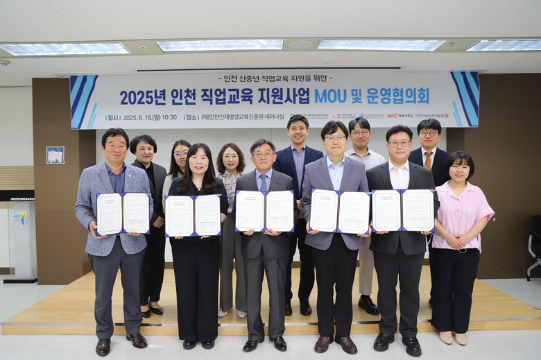 진흥원은 지난 6월 16일 ‘2025년 신중년 대상 직업교육 지원사업’의 성공적인 추진을 위해 지역 전문대학, 직업전문교육기관과 업무협약(MOU)을 체결하고, 사업 운영 협의회를 개최했다고 밝혔다. 이번 사업은 인천 신중년층(50~65세)의 미래 준비를 적극 지원하기 위해 자격증 취득 또는 취업에 유리한 실무 중심 교육과정을 운영하는 사업이다