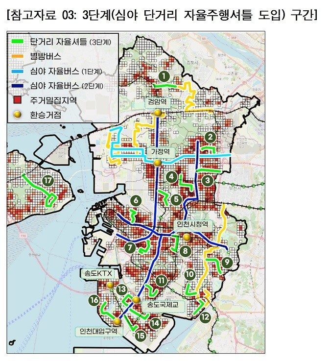 - 3단계(셔틀도입): 심야버스 접근성이 취약한 주거밀집지역을 대상으로 지하철역과 주거지를 연결하는 ‘단거리 자율주행셔틀’을 도입