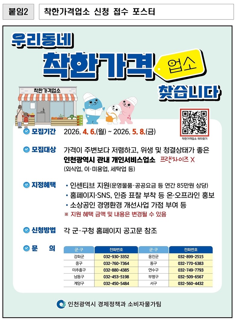 - 공공요금 지원부터 홍보·가점까지 종합 인센티브 제공 - [인천 세계타임즈=심하린 기자] 인천광역시(시장 유정복)는 물가안정의 든든한 버팀목인‘착한가격업소’확대를 위해 4월 6일부터 5월 8일까지 ‘착한가격업소’신규 업소를 모집한다고 밝혔다.