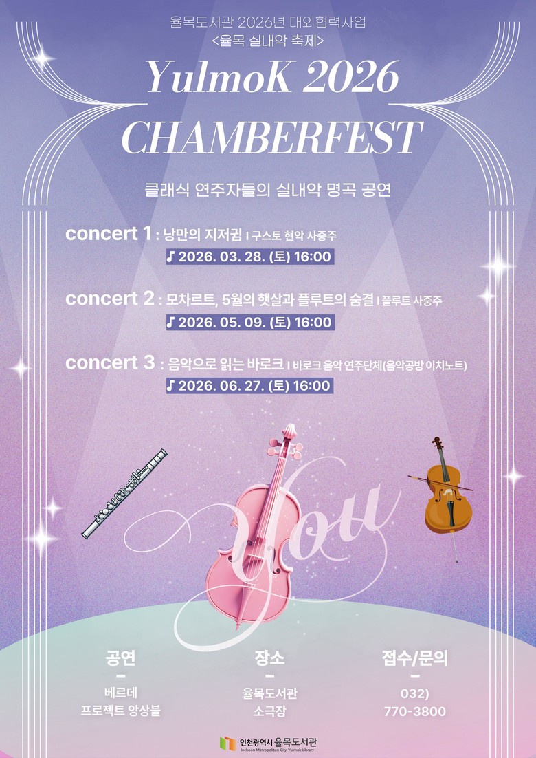 - 도서관을 독서·공연 어우러진 생활문화 공간으로 확대 - [인천 세계타임즈=심하린 기자] 인천광역시(시장 유정복)는 율목도서관에서 지역 주민들이 일상 가까이에서 클래식 음악을 즐길 수 있도록 ‘율목 실내악 축제’을 개최한다고 밝혔다.