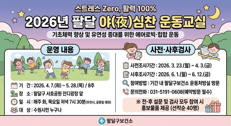 팔달구보건소 관계자는 “지난해 참여한 시민들의 만족도가 높고, 추가로 운영해 달라는 요청이 있어 올해도 야간 운동교실을 운영하게 됐다”며 “시민들이 일상에서 즐겁게 운동하며 건강을 관리하는 계기가 되길 바란다”고 말했다.