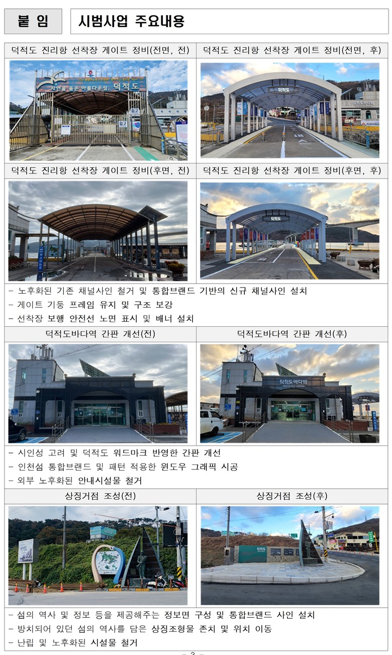 시범사업은 행정안전부 공모 당시 제안했던 덕적도를 대상으로 추진됐으며, 통합브랜드와 연계한 인천섬 로컬디자인을 적용해 지역 가치를 높이는 데 중점을 두었다. 주요 사업 내용은 ▲덕적도 진리항 선착장 게이트 정비 ▲덕적도바다역 간판 개선 ▲상징 거점 조성 등이다.