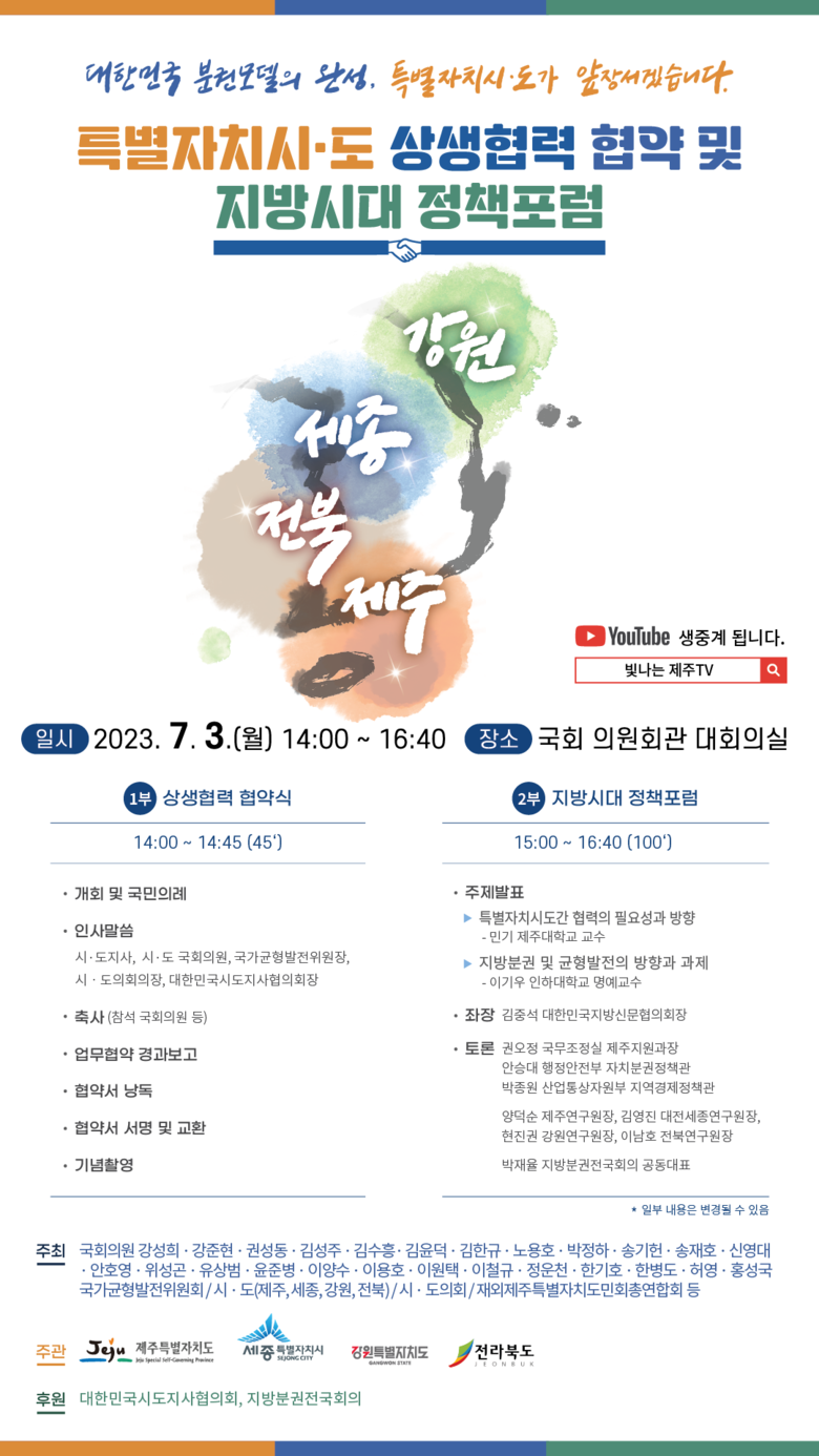 이날 포럼에서는 제주대학교 민기 교수가 ‘특별자치시도 상생협력의 필요성과 방향’을, 인하대학교 이기우 명예교수가 ‘지방분권 및 지역균형 방향과 과제’에 대해 발표하고 패널토론이 진행된다.