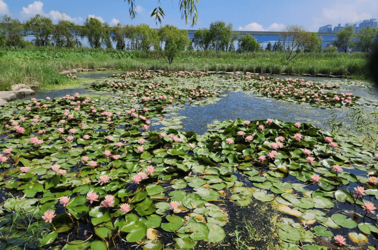 맥도생태공원 내 겨울 철새들의 서식처로 사랑받고 있는 ’하중도 습지‘에는 대규모 연꽃단지가 조성돼 있다. 단지 내 조성된 보행데크를 이용하면 더 가까이에서 연꽃을 관람할 수 있다.