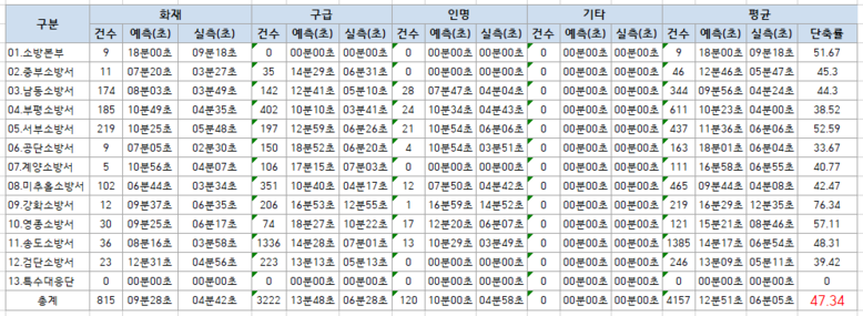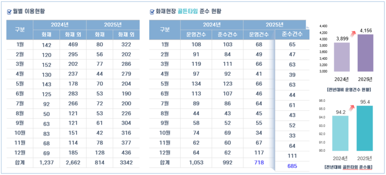 * 준수건수 : 긴급차량 우선신호 서비스를 이용해 골든타임(7분이내) 이내에 도착한 건수