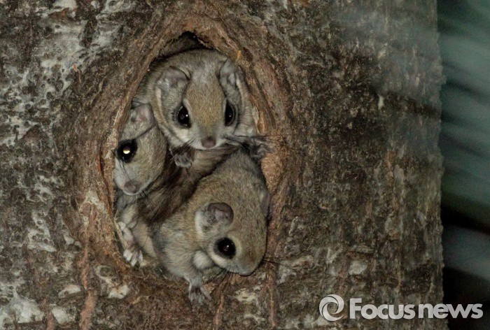 (포천=포커스뉴스) 경기도 포천시 관인면 지장산 자락의 까막딱따구리 둥지를 차지하고 겨울잠을 자던 하늘다람쥐(천연기념물 328호) 가족이 예년보다 포근한 겨울이 계속되자 10일 오전 나뭇구멍 밖으로 세상을 엿보고 있다. 이 중 한마리는 하늘을 활공해 숲속으로 사라졌다. 하늘다람쥐와 다람쥐는 추운 겨울에 겨울잠을 자지만, 날씨가 포근 할 때는 잠에서 깨어나 일시적 활동을 한다. 그러나 청설모는 겨울잠을 자지 않고 겨우내 활동한다.