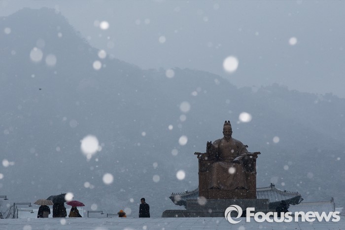 (서울=포커스뉴스) 전국에 눈이 내리는 3일 오전 서울 종로구 세종대로 광화문에서 출근길 사람들이 걸음을 옮기고 있다.