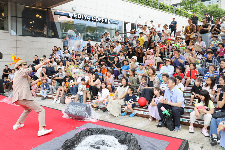 | ▲ 25일 서초책있는거리에서 열린 5월 북크닉 행사에서 관객들이 모여 버블쇼 공연을 관람하고 있다. |