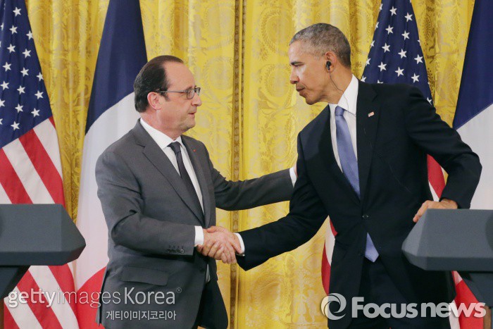 | △ (워싱턴DC/미국=게티/포커스뉴스) 24일(현지시간) 미국 백악관에서 방미한 프랑수아 올랑드 프랑스 대통령(왼쪽)과 버락 오바마 미국 대통령이 악수를 하고 있다. ⓒ게티이미지/멀티비츠 photo@focus.kr |