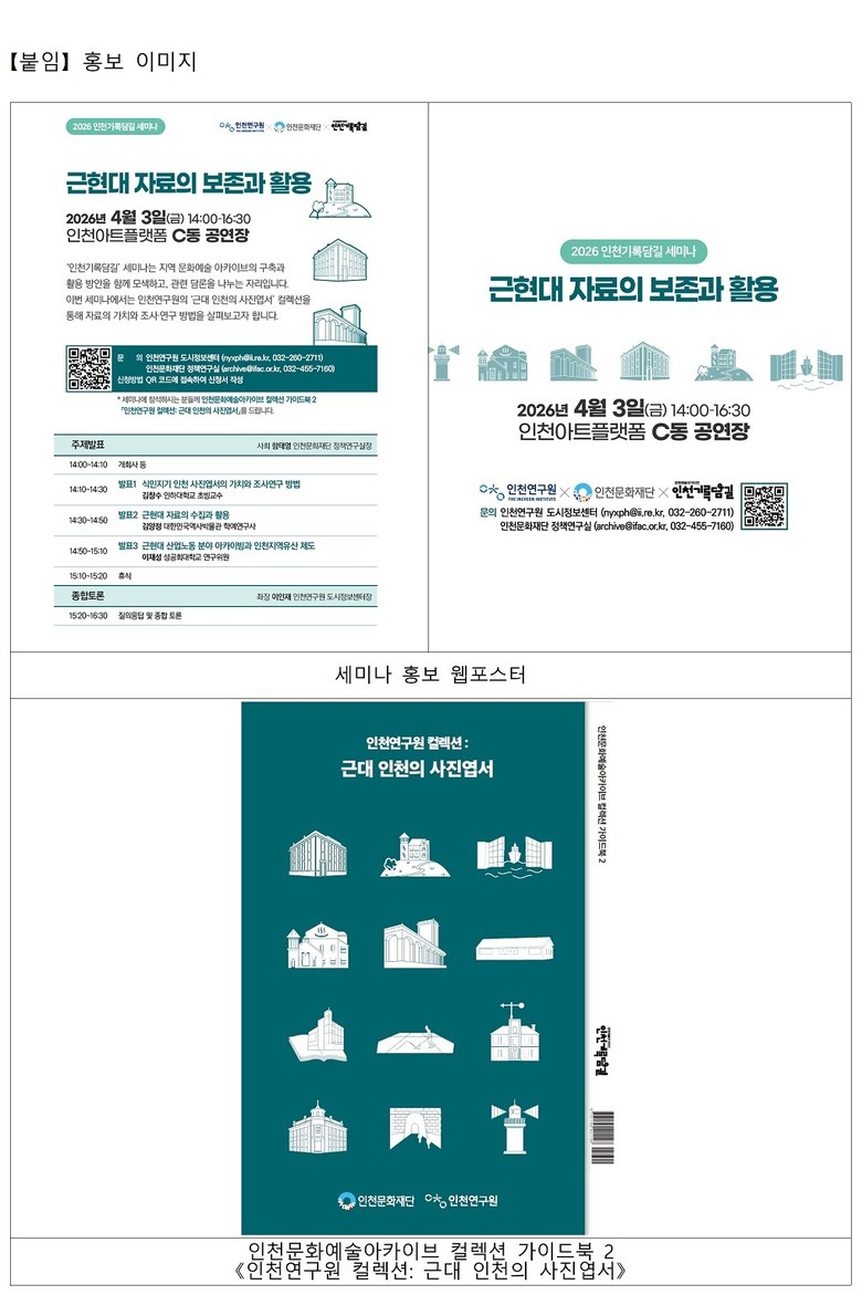 세미나에서는 ‘근대 인천의 사진엽서’ 컬렉션을 기반으로 제작한 『인천문화예술아카이브 컬렉션 가이드북 2』도 함께 공개된다. 해당 가이드북은 사진엽서 시리즈 총 10개, 118면으로 구성되어 있으며, 참가자에게 무료 배포된다. 인천연구원 컬렉션과 가이드북은 인천기록담길 누리집(i-archive.ifac.or.kr)을 통해서도 공개될 예정이다.