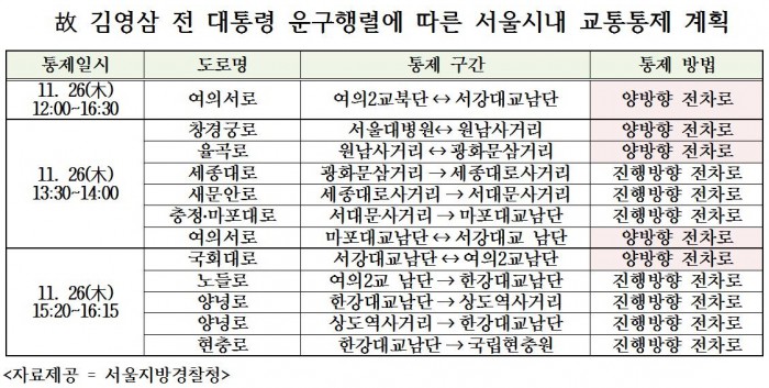 [세계타임즈 이영진 기자] 26일 고(故) 김영삼 전 대통령의 영결식이 진행되는 가운데 운구행렬 경로에 따라 이날 오후 서울시내 일부 구간의 교통이 통제된다.