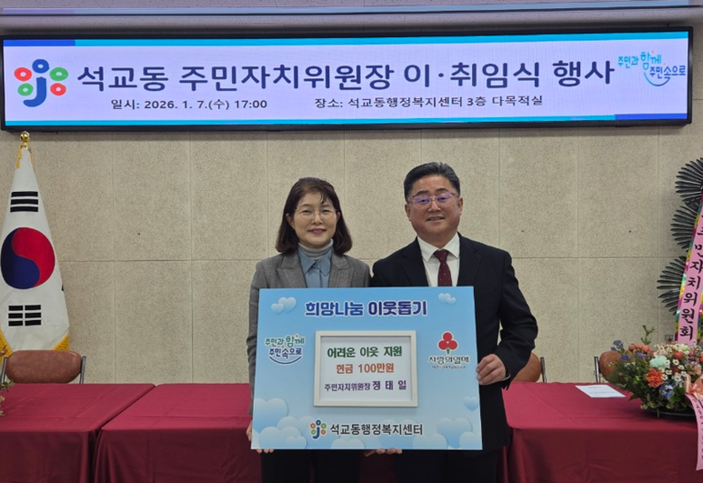 [중구 세계타임즈=이채봉 기자] 대전 중구 석교동(동장 강민서)는 2026년도 석교동 주민자치위원장으로 선출된 정태일 주민자치위원장이 이웃돕기 성금 100만 원을 전달하며 지역사회에 온정을 전했다고 11일 밝혔다.