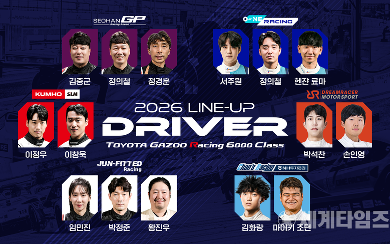 [세계타임즈=방춘재 기자] CJ대한통운이 후원하는 오네 슈퍼레이스 챔피언십이 2026시즌 토요타 가주 레이싱 6000 클래스 팀별 최종 라인업을 발표했다.