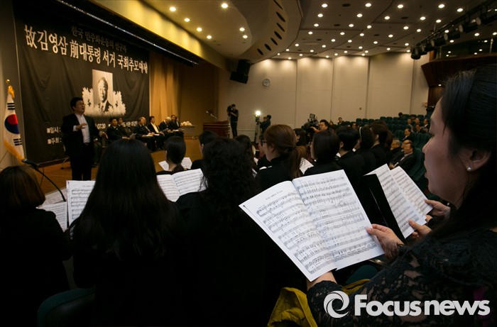 | △ 26일 오전 서울 여의도 국회도서관에서 열린 故 김영삼 전 대통령 추모 예배에 참석한 성가대가 찬송가를 부르고 있다. <사진제공=포커스뉴스> |