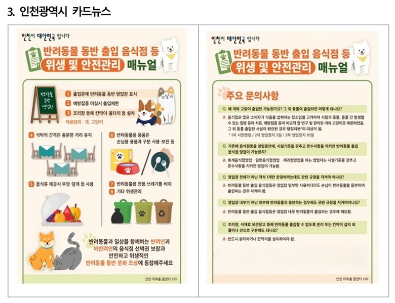 인천시는 제도 시행 초기 혼선을 줄이기 위한 준비와 지원을 지속적으로 강화하여 반려동물과 사람이 함께 공존하는 안전하고 즐거운 외식문화가 자리 잡을 수 있도록 할 계획이다.