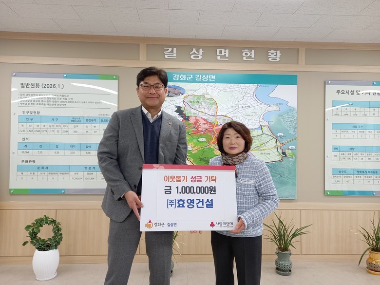 [강화군 세계타임즈=심하린 기자] 강화군 길상면(면장 서광석)은 지난 11일, ㈜효영건설(대표 나인숙)에서 지역 내 어려운 이웃을 위해 사용해 달라며 이웃돕기 성금 100만 원을 기탁했다고 밝혔다.