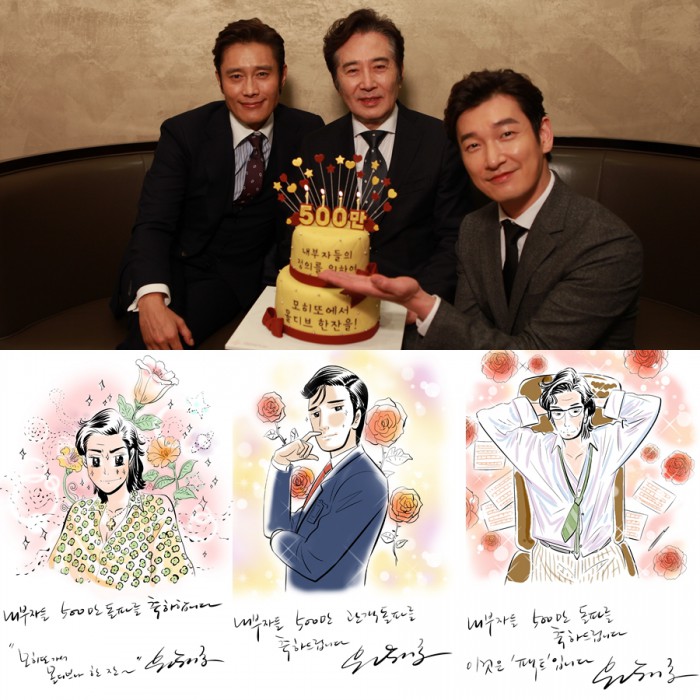 | △ 영화 '내부자들'이 500만 관객수 돌파를 기념해 배우 이병헌, 조승우, 백윤식이 축하 케익을 든 인증샷(상단)을 선보이고 있다. 동명의 원작 웹툰 작가 윤태호는 미소년 스타일의 캐릭터 이미지(하단)를 공개했다. <사진제공=쇼박스> |