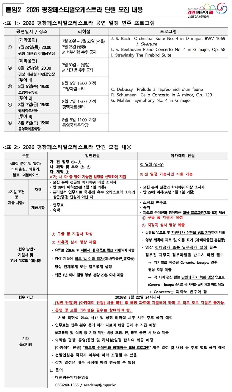 신청은 대관령음악제 누리집(mpyc.kr)을 통해서만 지원할 수 있으며, 접수 기간은 3월 22일(일)까지이다. 지원서를 비롯해 일반 단원은 자유곡, 아카데미 단원은 지정곡 연주 영상을 함께 제출해야 한다.