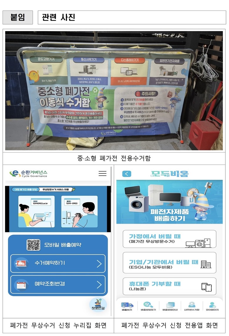 기존 냉장고·세탁기 등 12kg 이상 대형 폐가전은 1개만 버리더라도, 중·소형 폐가전은 5개 이상 모아 배출하면 전화(1599-0903), 누리집(15990903.or.kr), 전용 앱 ‘폐전자제품 모두비움’을 통해 무상 방문수거가 가능했다.