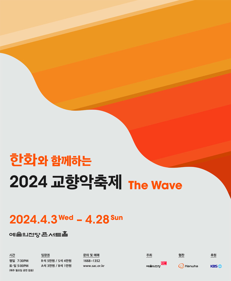한편, ‘교향악축제’는 4월 3일(수)부터 28일(일)까지 23일간 예술의전당 콘서트홀에서 개최된다. 매해 새로운 주제에 맞춰 열리는 교향악축제는 올해 ‘더 웨이브(The Wave)’를 부제로, 새싹이 움트는 4월을 클래식의 대향연으로 가득 채운다. 이번 무대를 위해 열정을 쏟은 23개 단체의 클래식 물결들이 조화롭고 아름다운 음악적 파동을 이루며 따뜻한 온기와 감동을 전할 예정이다.