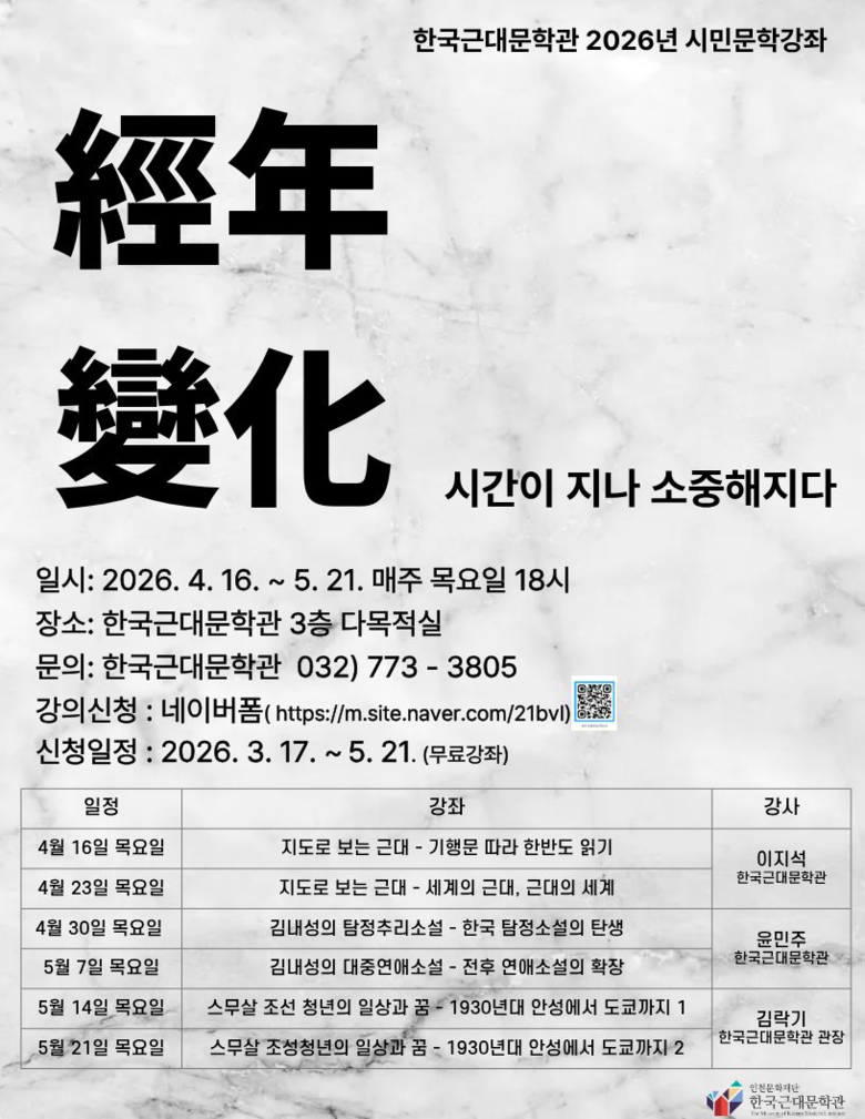 [인천 세계타임즈=심하린 기자] 인천문화재단 한국근대문학관이 2026년 4월 16일(목)부 총 6회에 걸쳐, 매주목요일 <經年變化 – 시간이 흘러 소중해지다>강좌를 진행한다.