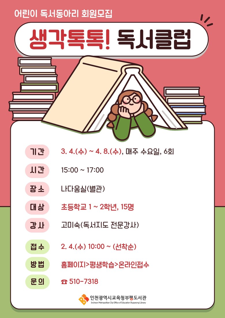 모집은 2월 6일 오전 10시부터 부평도서관 누리집에서 선착순으로 진행되며, 관내 초등학교 1~2학년 학생이면 신청할 수 있다.