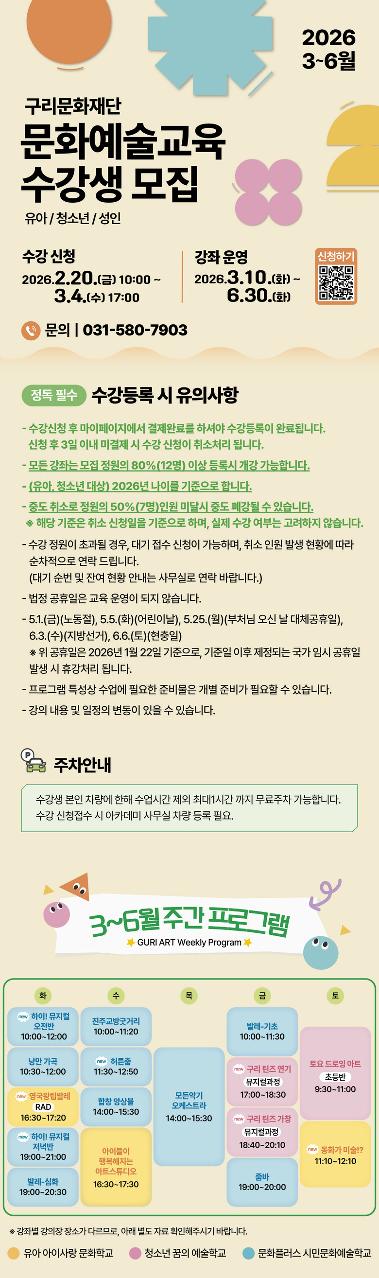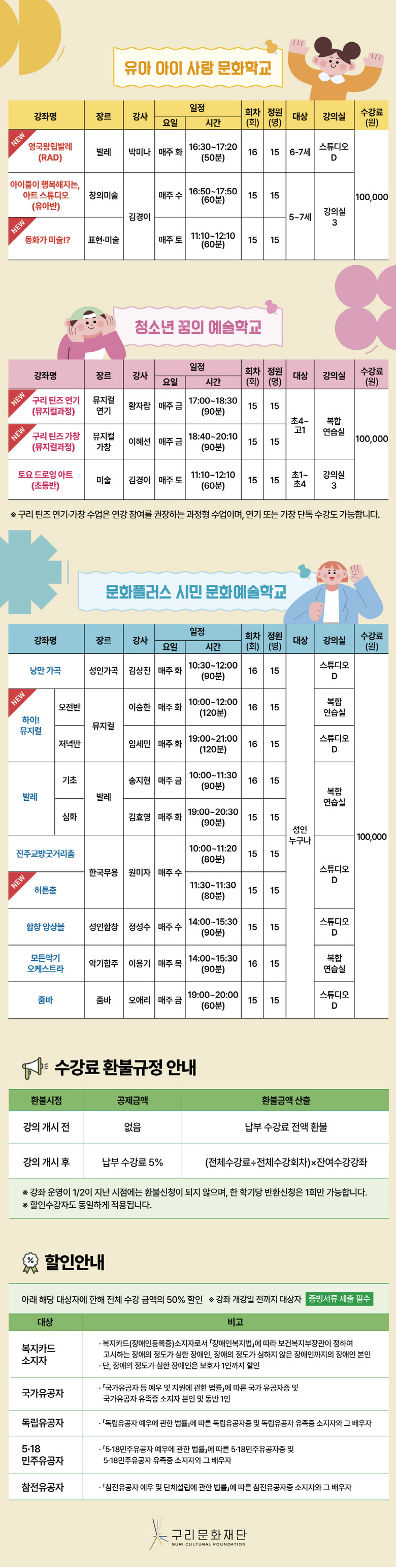 구리문화재단 문화예술교육은 ▲유아 ‘유아 아이사랑 문화학교’ ▲청소년 ‘청소년 꿈의 예술학교’ ▲성인 ‘문화플러스 시민문화예술학교’로 운영되며, 나이와 수준에 맞춘 체계적인 교육 과정을 제공한다.