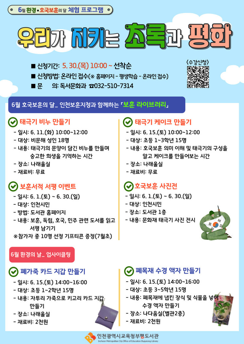 또한, 호국보훈의 달을 맞아 ‘보훈 라이브러리’ 사업의 일환으로 ▶6월 11일 「태극기 비누 만들기(비문해 성인 대상) ▶6월 15일 「태극기 케이크 만들기」(초등 1~3학년 대상) 등을 실시한다.