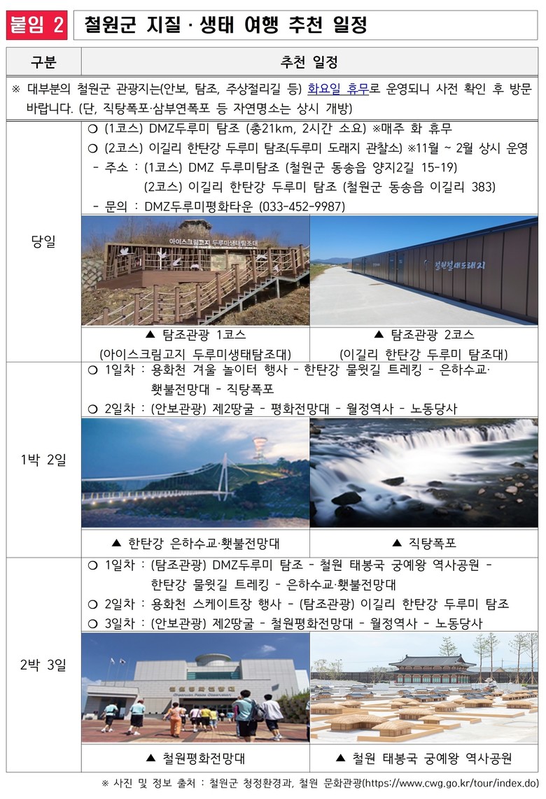 한편, ‘DMZ두루미평화타운’은 천연기념물 보호와 생태관광을 연계한거점 시설로, 자연환경해설사의 안내를 통해 두루미 생태와 DMZ 일대의 자연·역사적 가치를 체계적으로 체험할 수 있는 탐조 프로그램을 운영하고 있다.