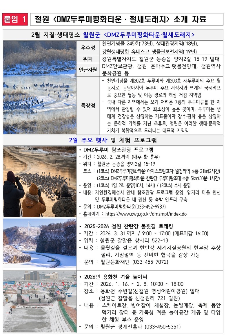 강원특별자치도 관계자는 “철원 DMZ두루미평화타운·철새도래지 일대는 평화와 생명이 공존하는 공간으로, 겨울철에만 만날 수 있는 두루미의 장관을 통해 자연의 소중함을 되새길 수 있는 대표적인 생태명소”라며, “2월에는 철원에서 지질·생태·평화가 어우러진 특별한 겨울 여행을 경험하시길 바란다”고 말했다.