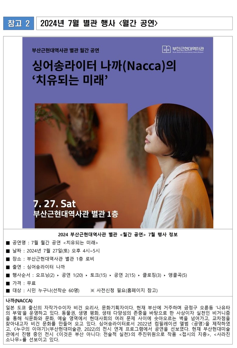 ◈ 7.27. 16:00 월간 공연 <부산이 좋아> 운영… 일본 도쿄 출신 싱어송라이터 '나까' 초청해 '치유되는 미래' 공연 진행