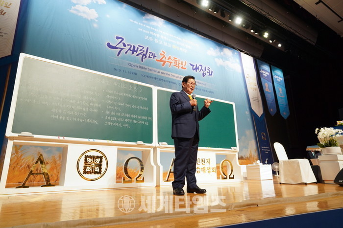 이만희 총회장은 ‘하나님의 목적과 약속, 우리의 소망’이라는 주제로 성경의 결론인 요한계시록에 숨겨진 하나님의 목적에 대해 2시간 가량 막힘없이 설파했다.