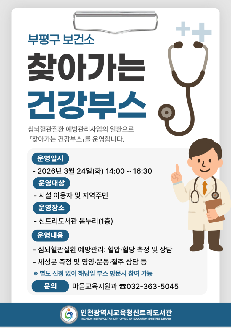 도서관 이용자와 지역 주민 누구나 사전 신청 없이 현장에서 참여할 수 있으며, 자세한 사항은 도서관 누리집을 확인하거나 마을교육지원과(☎032-363-5045)로 문의하면 된다.