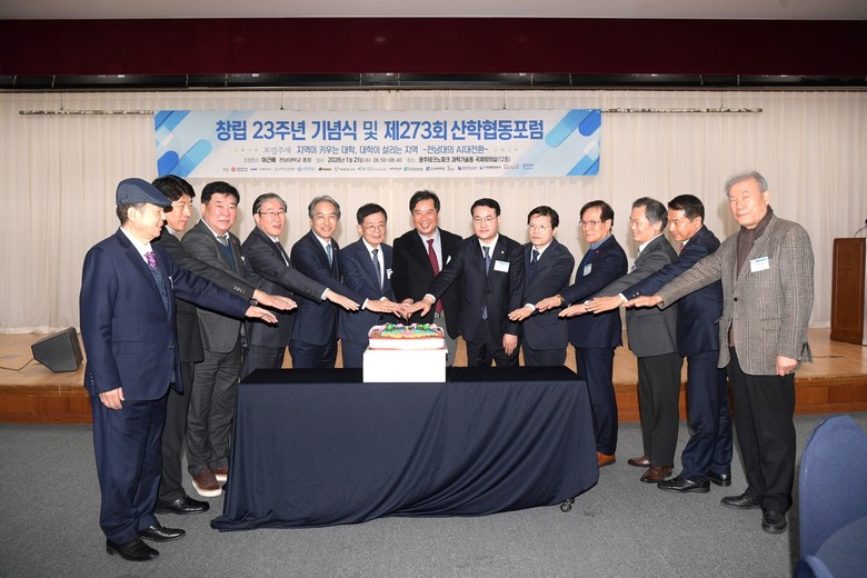 [광주 세계타임즈=손권일 기자] 김영문 광주광역시 문화경제부시장이 21일 오전 광주테크노파크 국제회의실에서 열린 제273회 산학협동포럼에 참석해 참석자들과 함께 창립23주년 축하떡을 자른 뒤 기념촬영을 하고 있다. /광주광역시 제공