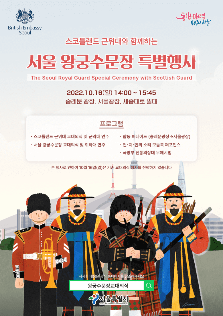 [서울 세계타임즈=이장성 기자] 서울시는 영국 스코틀랜드 왕실근위대의 서울 방문을 맞아 스코틀랜드 근위대와 서울 왕궁 수문장, 국방부 전통의장대가 함께하는 ‘서울 왕궁수문장 특별행사’를 10월 16일(일) 14시부터 15시 50분까지 숭례문광장, 서울광장, 세종대로 일대에서 개최한다.