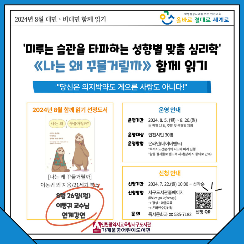 8월 선정 도서는 연세대학교 상담심리연구실에서 공동 집필한 ‘나는 왜 꾸물거릴까?’이다. 참여자들은 네이버밴드를 통해 8월 5일부터 26일까지 읽기 진도표에 따라 도서를 함께 읽고 생각과 느낌을 공유한다. 독서전문가의 지도 아래 진행하며, 8월 26일에는 이동귀 교수의 연계 강연이 예정돼 있다.