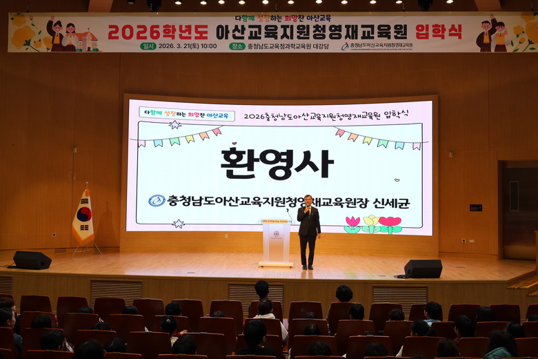 [아산시 세계타임즈=이현진 기자] 충청남도아산교육지원청(교육장 신세균)은 지난 21일(토) 충청남도교육청과학교육원에서 신입생 및 학부모, 영재교육 담당강사 등 500여명이 참석한 가운데 2026학년도 아산교육지원청영재교육원 입학식을 개최했다.