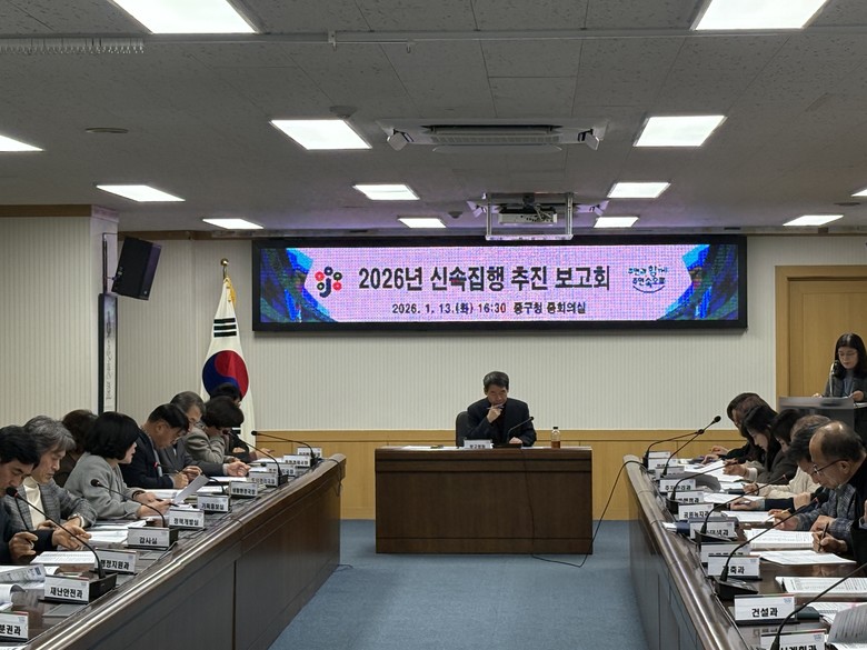 중구는 13일, 부구청장 주재로 ‘2026년 신속집행 추진 보고회’를 개최하고 전 부서의 신속집행 추진계획을 점검했다. 특히, 연초부터 집행이 차질 없이 진행될 수 있도록 1분기 내 행정절차를 집중적으로 추진하기로 했다.