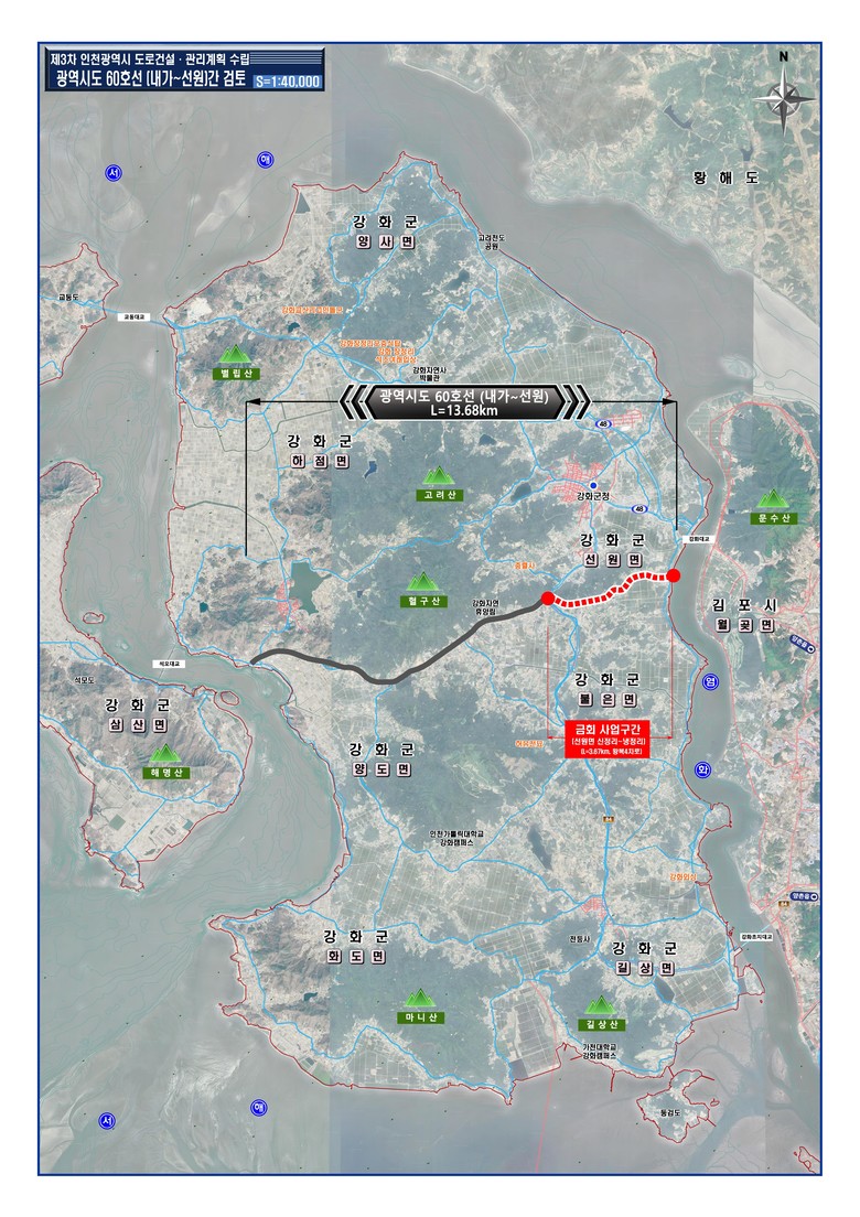 광역시도60호선 도로사업은 계양∼강화 고속도로 종점인 선원면 신정리에서 현재 공사 중인 국지도84호선 종점인 선원면 냉정리를 연결하는 총연장 3.67km, 왕복4차로 규모로 추진된다. 사업이 완료되면 고속도로와 연계한 강화군 내 주요 간선도로망이 서로 연결*되어 접근성이 크게 개선되고 지역 주민과 관광객의 교통 편의도 한층 높아질 것으로 기대된다.