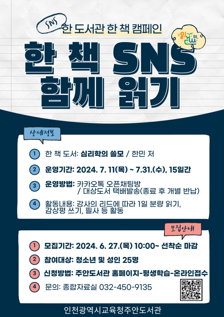 올해 주안도서관 한 책 캠페인 선정 도서는 한민 저자의 ‘심리학의 쓸모’로, 마음·감정을 주제로 선정했다. ‘함께 읽기’는 카카오톡 오픈채팅방을 통해 15일간 독서지도 전문가와 함께 책을 읽고 감상을 나누는 방식으로 진행하며, 청소년 이상 성인 25명을 대상으로 운영한다.